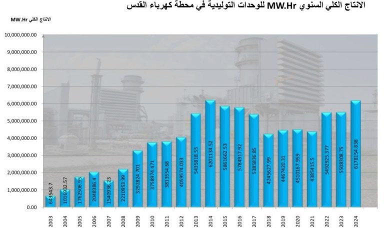 معدلات إنتاج غير مسبوقة ، وأرقام استثنائية ، وتوليد يسجل لأول مرة بتأريخ المحطة ، تحققه الملاكات العاملة بمحطة توليد كهرباء القدس الغازية خلال عام ٢٠٢٤