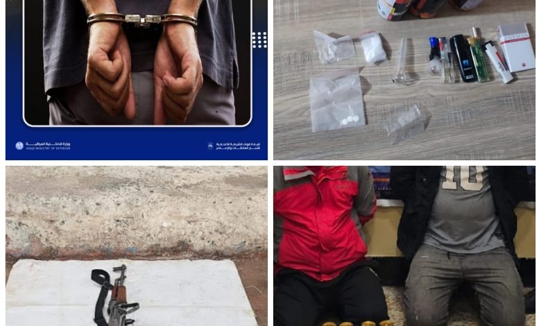 بجهد أمني واستخباري نفذت قطعات الفرقة الخامسة شرطة اتحادية عمليات أمنية متميزة ألقت خلالها القبض على(7) متهمين بينهم امرأة وفق أحكام قانونية مختلفة تضمنت (المخدرات، السرقة، مشاجرة، تهديد، مخمورين) في مناطق (السعادة، الشعب، حي اور، أم الكبر والغزلان، الدسيم) ببغداد ، مع ضبط (مادة الكريستال تقدر بحوالي 220 ملغرام، 3 بايب للتعاطي، مشروبات كحولية) ، كما تمكنت قطعات اللواء العشرون واثناء عملية تفتيش احدى الدور جراء مشاجره في منطقة (الباوية) من العثور على (بندقية كلاشنكوف) ، تم إحالة المتهمين والمضبوطات اصوليا إلى الجهات المختصة .ق