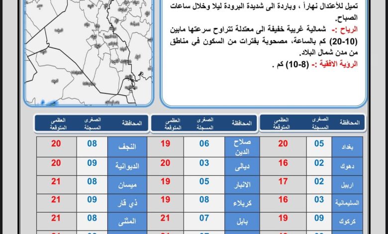 النشرة الجوية اليوم الأربعاء الموافق ٢٩/كانون الثاني والايام التي تليه والصادرة عن الهيئة العامة للانواء الجوية والرصد الزلزالي _قسم التنبؤ الجوي ويتم تحديثها يوميًا حسب مستجدات الحالة الجوية ( بمشيئة الله تعالى) ق