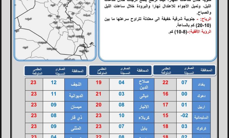 النشرة الجوية اليوم الثلاثاء الموافق ٤/شباط والايام التي تليه والصادرة عن الهيئة العامة للانواء الجوية والرصد الزلزالي _قسم التنبؤ الجوي ويتم تحديثها يوميًا حسب مستجدات الحالة الجوية ( بمشيئة الله تعالى) .ق