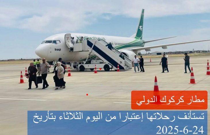 أعلنت إدارة مطار كركوك الدولي اليوم عن استئناف الرحلات الجوية من وإلى المطار، وذلك بعد توقف مؤقت استمر لعدة أيام بسبب التوترات الأمنية الإقليمية