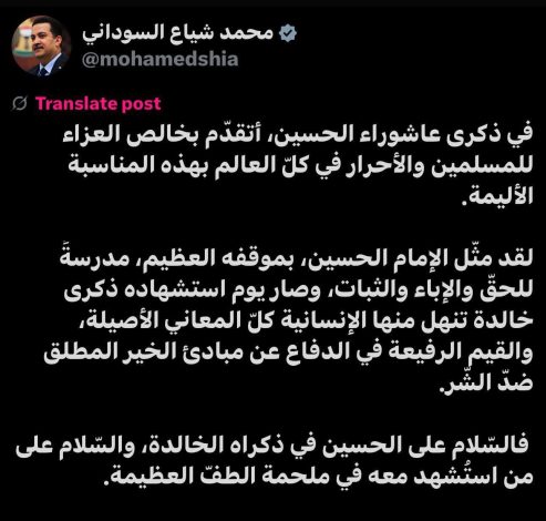 رئيس مجلس الوزراء السيد محمد شياع السوداني، في منشور على منصة إكس: